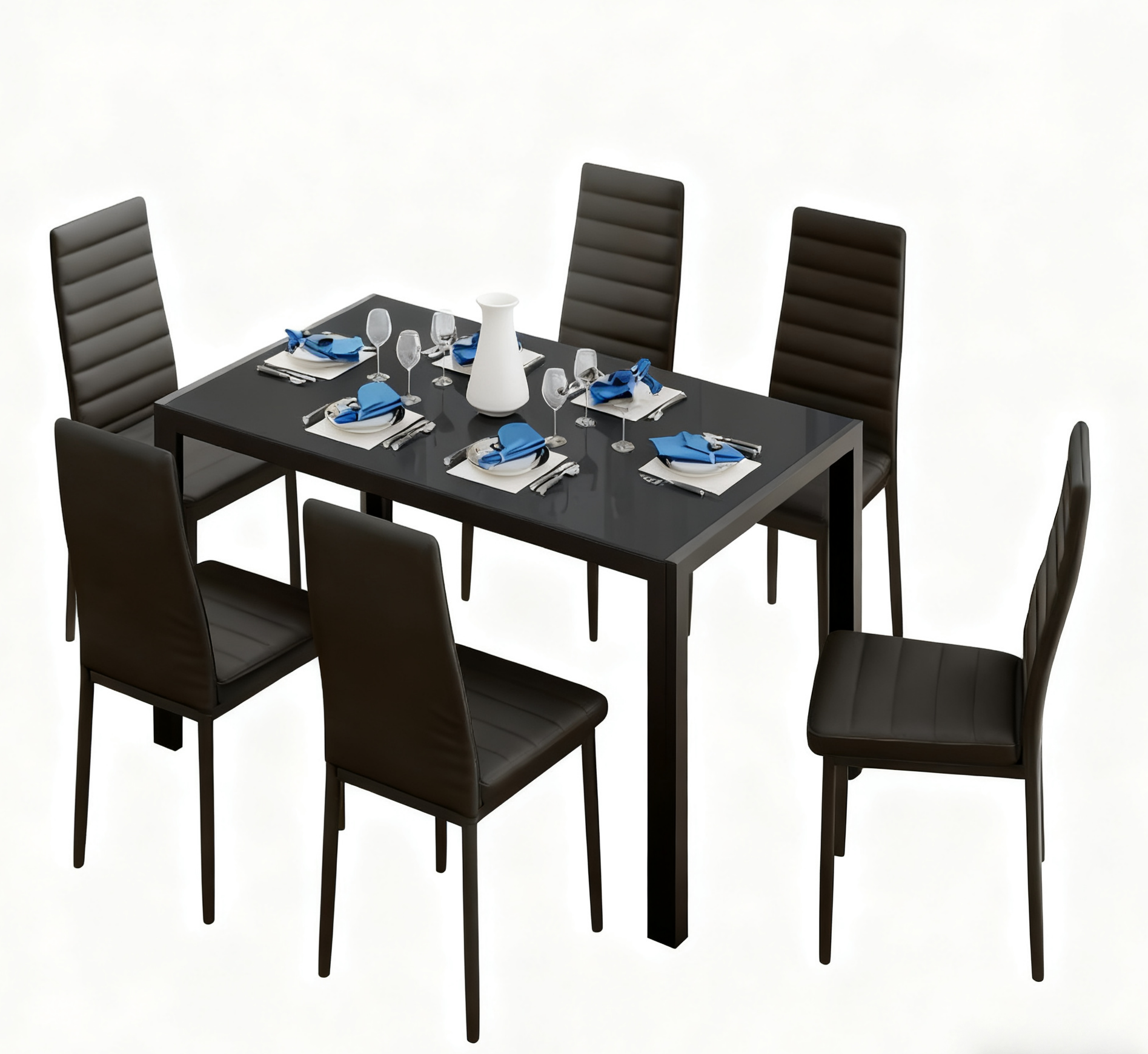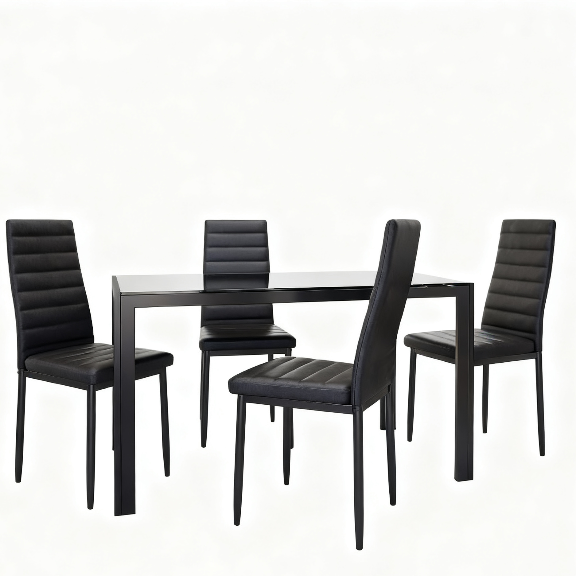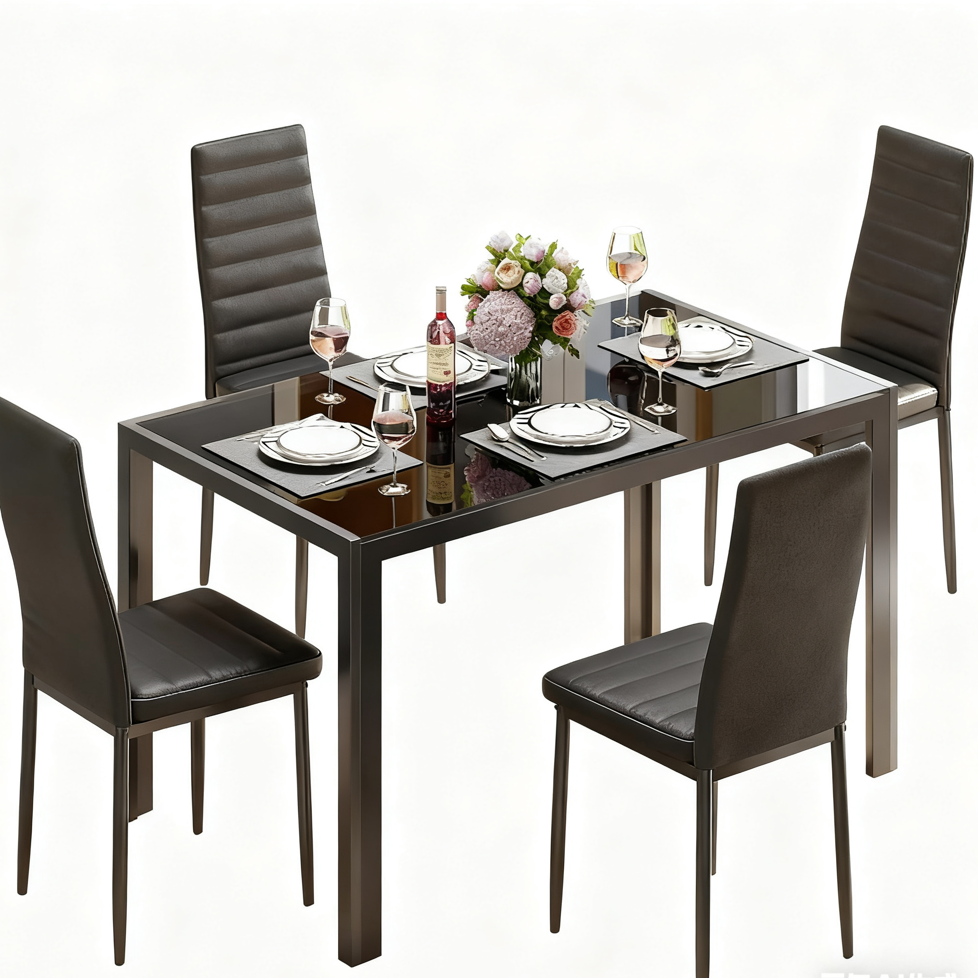 This dining table set for 4 includes a tempered glass dining table and four dining chairs
