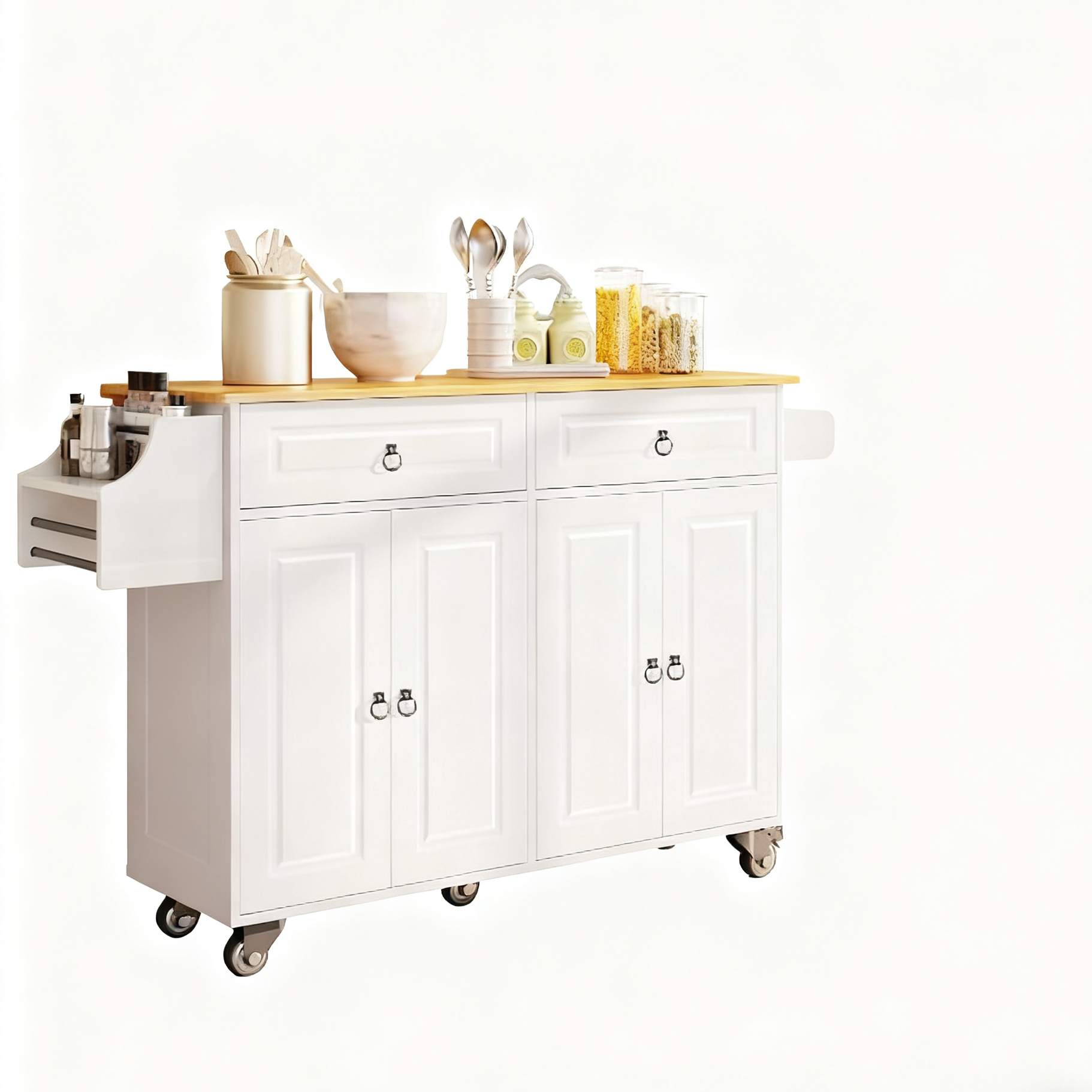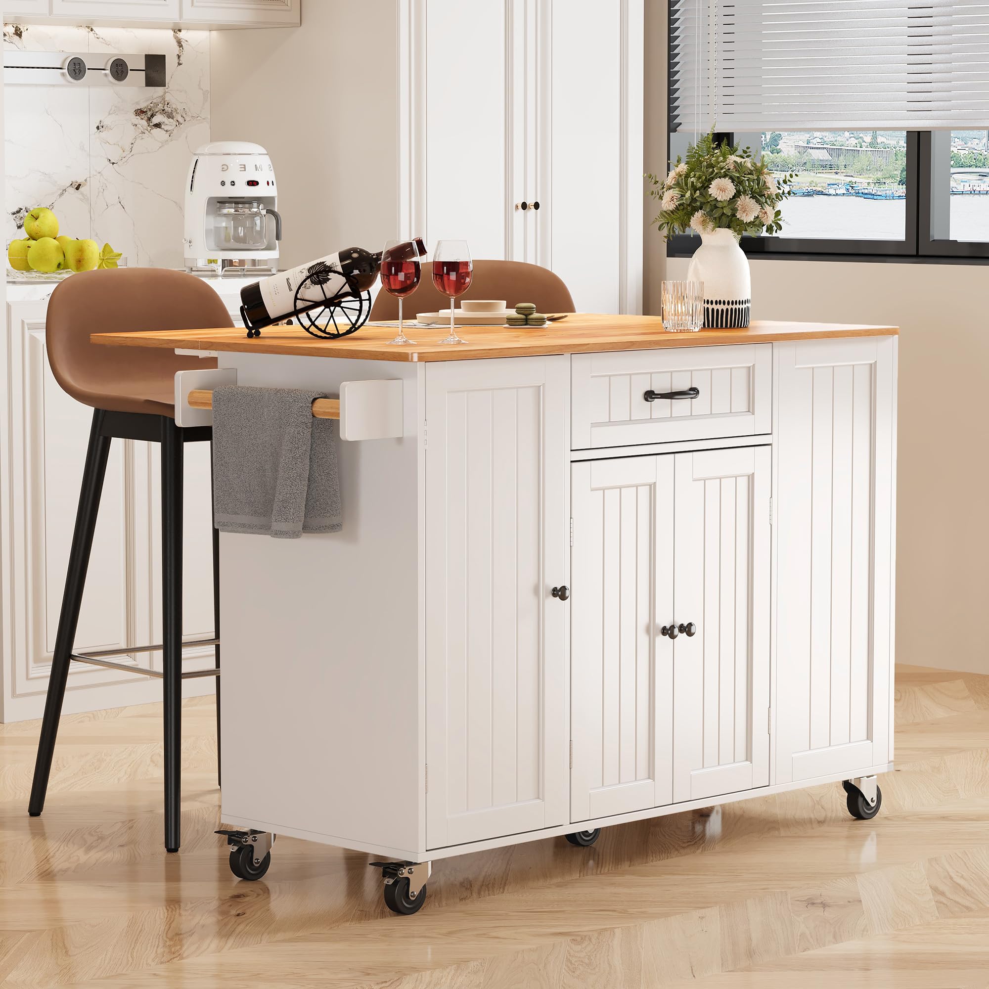 Equipped with five rolling wheels at the bottom, this kitchen island is easy to move around, with two locking wheels to keep it securely in place, even on uneven surfaces.
