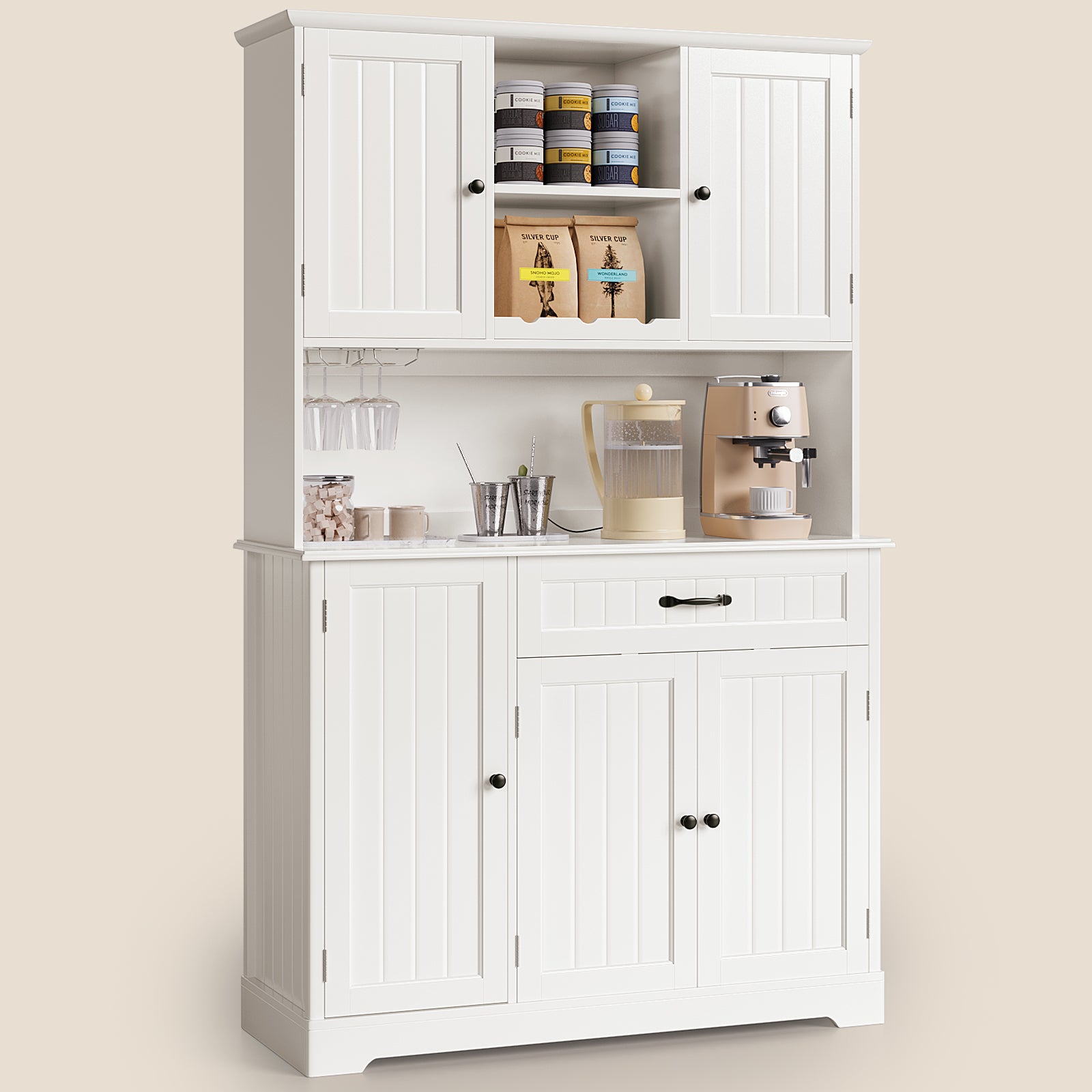 With 4 cabinet doors, 2 wide drawers, and 2 adjustable shelves, this buffet offers plenty of room for dishes, small appliances, or coffee bar essentials
