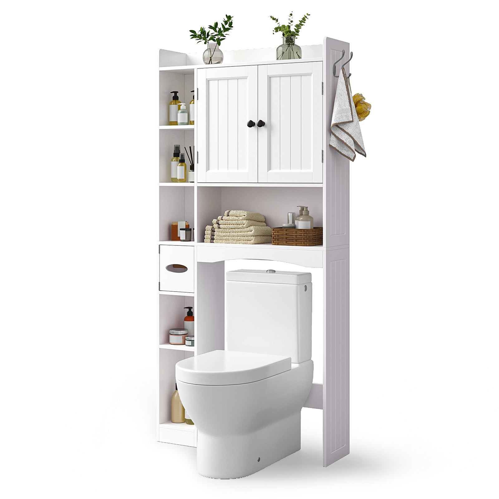 Bathroom Upper Toilet Storage Cabinet is a practical and elegant storage solution designed to improve space utilization. Featuring a white finish