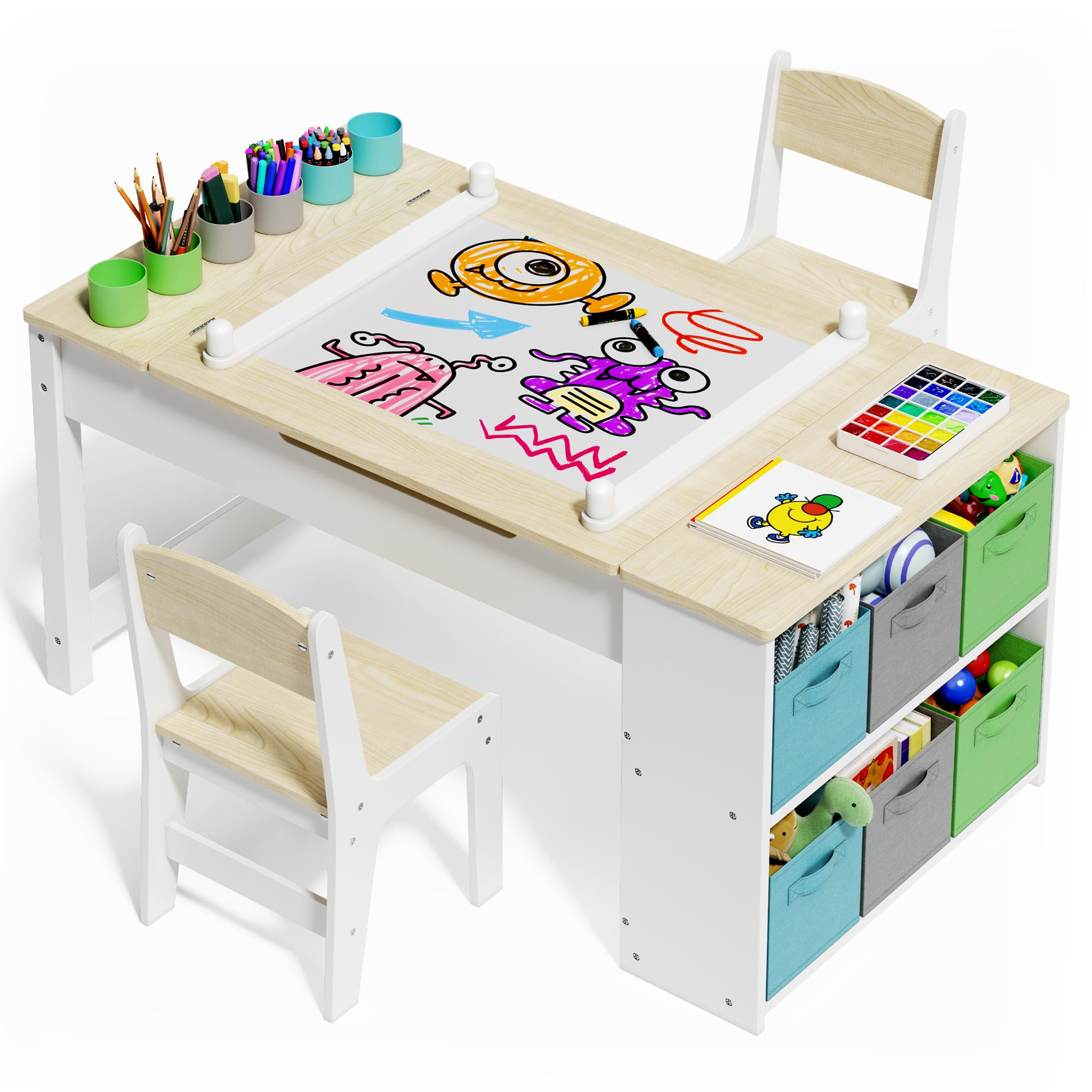 This set includes a sturdy children's drawing table with storage and two comfortable children's chairs
